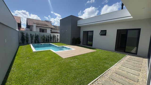 Casa lindíssima de alto padrão, nova, TÉRREA, excelente padrão de acabamento, pé direito alto, living integrado, escritório, lavabo, suíte com closet, + dois dormitórios, banheiro social, lavanderia, garagem coberta para dois carros lado a lado, amplo espaço nos fundos para receber os amigos, piscina, jardim. Pode ser financiada e analisa permuta. Agende agora mesmo a sua visita clicando abaixo!