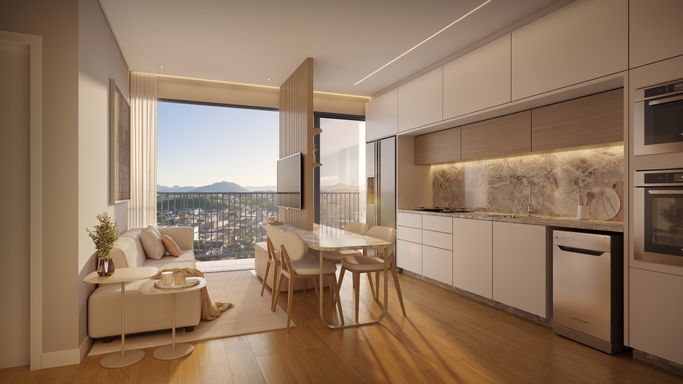 O empreendimento conta com apartamentos com plantas de 36,63m² a 58,69m², oferecendo opções de 1 ou 2 dormitórios, todos com living integrado, cozinha, área de serviço e 1 banheiro social, com excelente aproveitamento de espaço e funcionalidade.