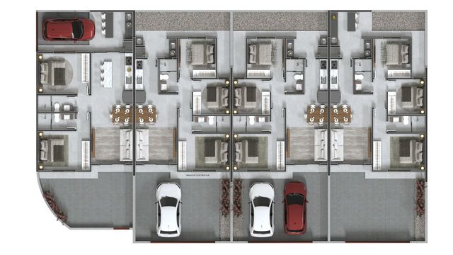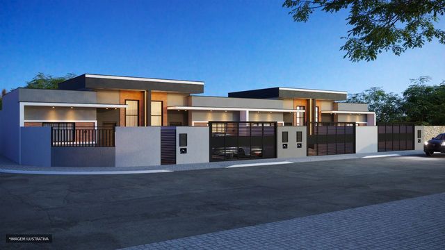 Contém suíte + 02 ou suíte + 03 dormitórios, sala de jantar e estar, cozinha com churrasqueira integrada, banheiro, área livre na frente e fundos do terreno e 2 vagas de garagem. Acabamento em gesso, massa corrida e Porcelanato.